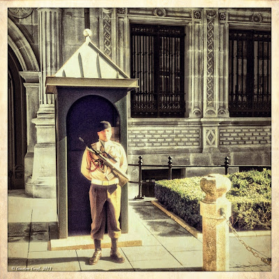 At this point there had been still some flaws in the picture to be corrected. Please note the colored part of the sentry box base that is in the shadow of the sentry box. I colored it but that was wrong. Also the left edge of the sentry box looks way too saturated plus there is part of an unwanted object on the lower edge of the picture, in front of the guard's right foot and the original frame of the Hipstamatic Ina's 1935 film also doesn't look good anymore. Now how to correct this?